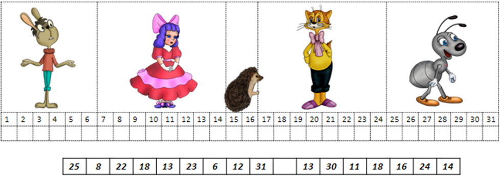 В этом году исполняется 55 лет, как был снят мультфильм «Незнайка учится» по произведению Николая Николаевича Носова. Образ Незнайки активно использовался в оформлении российского павильона на международной выставке в Шанхае (Китай). При этом комиксы для детей с участием Незнайки были известны и популярны в Китае в 1990-х годах. Имя Незнайки на китайский было переведено как ???, что означает… Подпиши все картинки и выпиши буквы, которые стоят в указанных клеточках.
