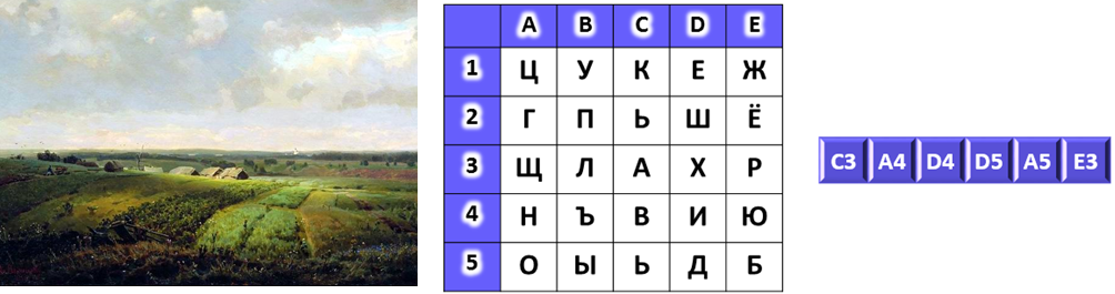 исторической живописи, младшего брата Виктора Михайловича Васнецова, Аполлинария Михайловича Васнецова. В Государственной Третьяковской галерее находится одна из его известных работ. Эту картину он написал в 1886 г. и попытался в ней осознать, что для него значат родные просторы и земля. Используя предложенную подсказку, выпиши буквы и прочти название картины справа налево.