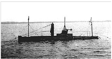 На этом рисунке изображена первая российская подводная лодка, официально принятая на вооружение. Это была субмарина «***», вошедшая в состав флота в 1903 году под обозначением «миноносец № 150». Она была вооружена двумя внешними решётчатыми торпедными аппаратами системы Джевецкого и имела полное водоизмещение 124 тонны.