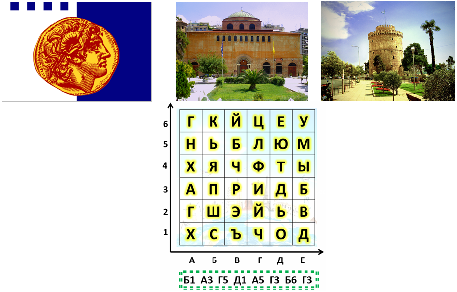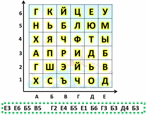 Чтобы узнать название города, выпиши буквы по указанным координатам и прочти слово слева направо.