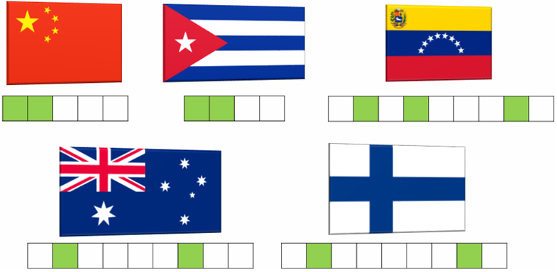 Чтобы узнать название города, запиши названия государств по их флагам. А из букв, которые стоят в выделенных клеточках, составь название города.