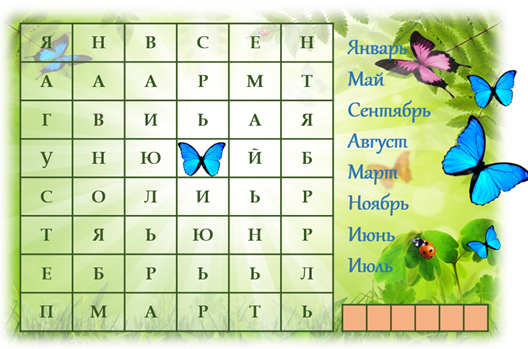 (4 балла) Вычеркни все слова справа из филворда, а из оставшихся букв составь слово и узнай, какой месяц подарил девочке волшебное колечко в сказке «12 месяцев». Впиши в ответе слово без пробелов и каких-либо знаков препинания.