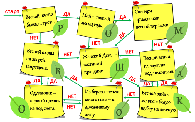 (5 баллов) Согласись или нет с утверждениями, и следуй по стрелкам. Собирай по дороге буквы и узнаешь, во время какого весеннего природного явления заяц и лиса оказались на одном бревне в рассказе Н. Сладкова «Двое на бревне». Впиши полученное слово в ответе без пробелов и каких-либо знаков препинания.