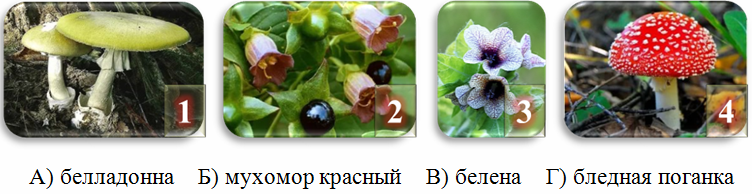Лето – это также пора, когда в лесу появляется много ягод и грибов. Другими словами, это особо опасное время, если хорошо не знаешь, какие ягоды и грибы безопасны для организма человека, а какие из них могут ему навредить. Соотнеси изображения особо опасных ягод и грибов с их названиями. Выбери правильный вариант ответа.