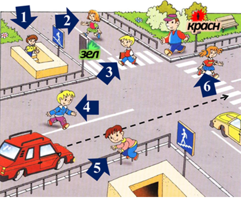 На улице нужно быть всегда очень внимательными. Особенную осторожность необходимо соблюдать, переходя проезжую часть. Рассмотри изображение и укажи номера тех ребят, которые не нарушают правила дорожного движения.