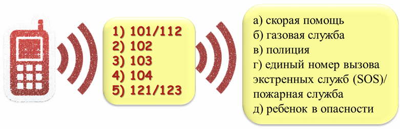 Соотнеси номера вызова экстренных служб с их названиями. В качестве ответа запиши сочетание пар цифра – буква так, чтобы цифры шли в порядке возрастания без пробелов и знаков препинания. Например, 1а2б3в