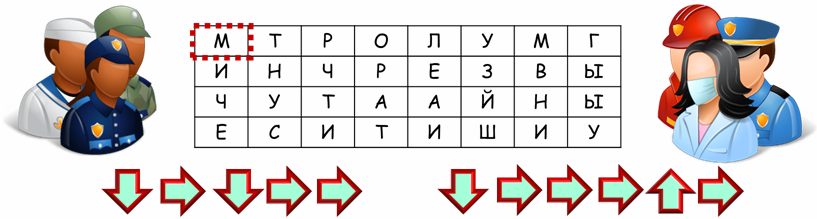 При всех упомянутых в данной работе чрезвычайных ситуациях могут быть пострадавшие. В такие времена спасатели разных стран объединяют свои усилия для того, чтобы спасти людей из-под завалов зданий и сооружений, из воды и огня. Для того, чтобы услышать голоса плененных выживших людей ежечасно проводится специальное мероприятие. Как оно называется? Воспользуйся алгоритмом из стрелок и прочти его название. В качестве ответа запиши только два разгаданных слова строго через один пробел, например, храбрый спасатель