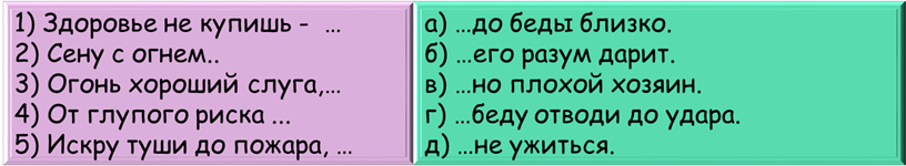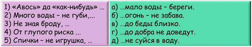 Соотнеси начало пословиц с их окончаниями. Выбери ту пословицу (пункт а, б, в, г или д), у которой нет подходящего окончания.