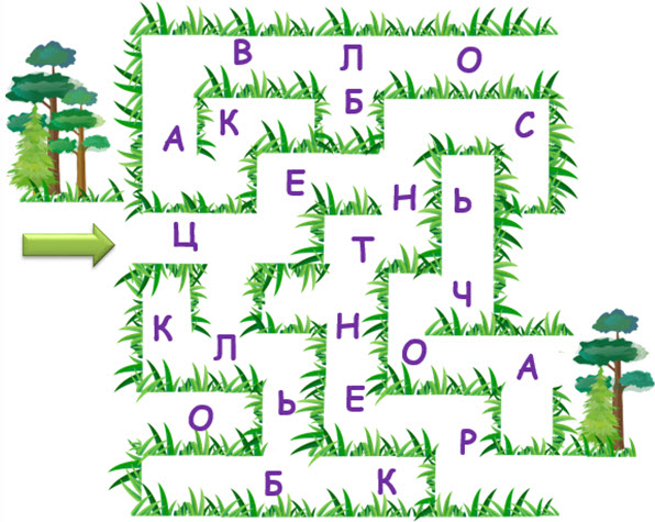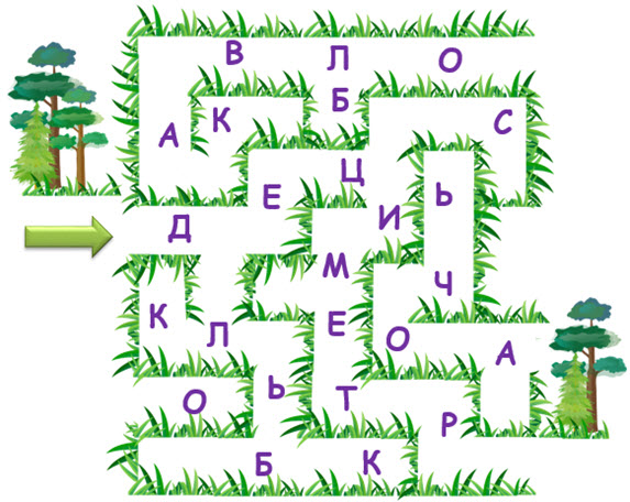 4. (по 2 балла за каждый пункт) Найди выход из лабиринта. На пути собери все буквы по порядку. Прочти полученное слово.