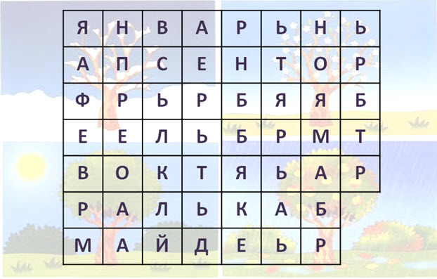 6. (2 и 1 балл за каждый пункт) Найди в таблице месяцы года. Слова могут изгибаться как угодно. Месяцев какой поры года там нет?