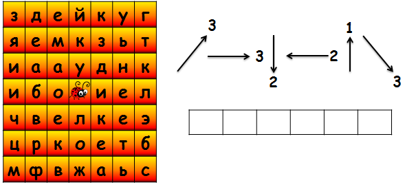 6. (4 балла) Двигаясь по стрелкам с цифрами (цифры обозначают номер клетки по указанному направлению), начиная каждый раз от выделенной клетки с божьей коровкой, прочти слово. Запиши полученное слово в ответе без кавычек и каких-либо знаков препинания. Например: наука