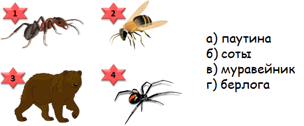 8. (6 баллов) Соотнеси животных и названия построек, которые для них характерны. Выбери верный вариант ответа.