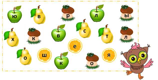 9. (7 баллов) Помоги Совёнку собрать яблоки и из букв, расположенных на них, составь слово. Какой цифрой на рисунке «Внешнее строение голубя» отмечено полученное слово? Запиши в ответе только нужную цифру без каких-либо знаков препинания. Например: 1