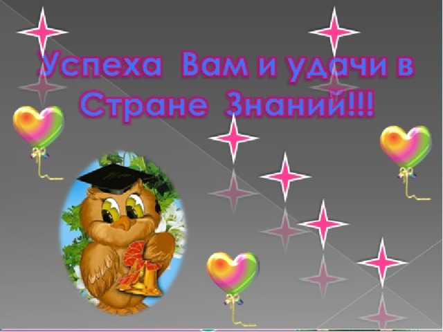 Ребята, вы большие молодцы! Вы вместе с родителями удалось освободить все школьные науки. Теперь вы смело можете отправляться в страну Знаний. Там ждёт вас много интересного! Каждый из вас заслуживает награды за сегодняшнее путешествие.