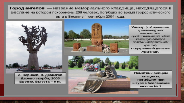 Год спустя на мемориальном кладбище Беслана, где захоронены жертвы теракта, состоялось открытие памятника «Древо скорби».