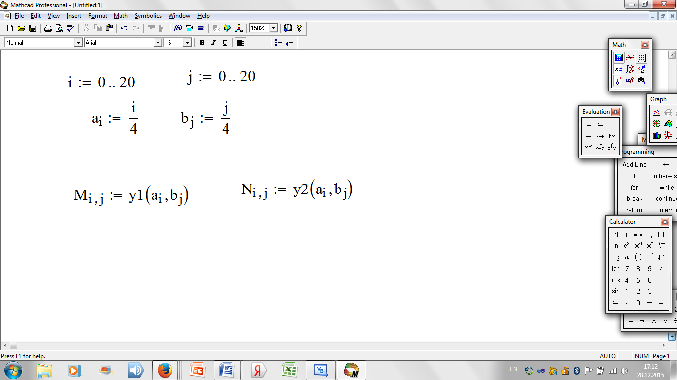 Поскольку элементы матрицы М – индексированные переменные с целочисленными индексами, то перед созданием матрицы требуется задать индексы в виде ранжированных переменных с целочисленными значениями, а затем из них сформировать сетку значений х и у – координат для аппликат z(x,y). Значения х и у могут быть любыми действительными числами.