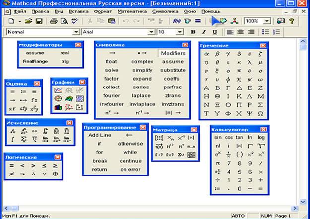 К семейству панелей инструментов «Математические» относятся девять панелей инструментов (панель инструментов «Модификаторы» является дополнением панели инструментов «Символика»). Эти панели инструментов отображены на рис. в рабочей области Mathсad. Каждая из панелей содержит набор кнопок, позволяющих ввести определенные математические операторы и символы, задать вычислительные операции и действия при вводе математических выражений или при проведении расчетов.
