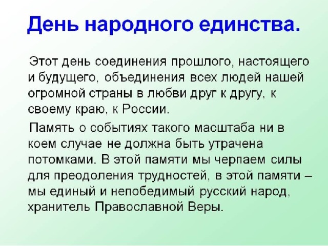 День народного единства – молодой праздник, который отмечается пышно и торжественно. Его цель – сплотить жителей России независимо от социального положения, национальности или вероисповедания. В этот день граждане страны вспоминают историческое событие, к которому приурочено это торжество, и устраивают массовые мероприятия.