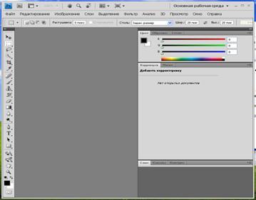 Бағдарламаны iске қосу үшiн келесi команда орындалады: Пуск-Программы -Adobe-Photoshop CS4. Бағдарламаны iске қосқаннан кейiн экранда Photoshop CS4 бағдарламасының негiзгi терезесi ашылады (4.1-сурет).