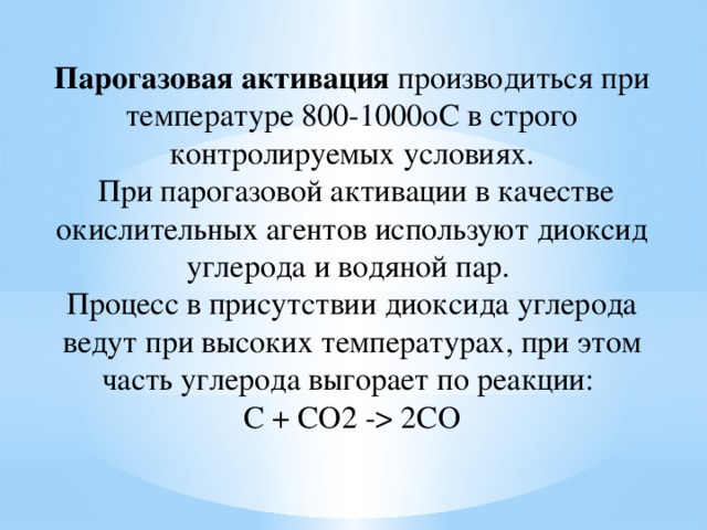 При парогазовой активации в качестве окислительных агентов используют диоксид углерода и водяной пар.