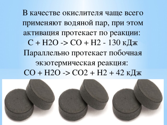 В качестве окислителя чаще всего применяют водяной пар, при этом активация протекает по реакции: С + Н2О - СО + Н2 - 130 кДж Параллельно протекает побочная экзотермическая реакция: СО + Н2О - СО2 + Н2 + 42 кДж