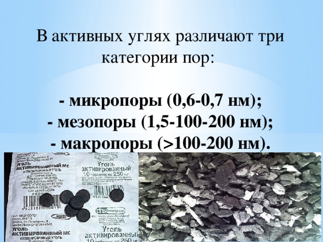 В активных углях различают три категории пор: - микропоры (0,6-0,7 нм); - мезопоры (1,5-100-200 нм); - макропоры (100-200 нм).