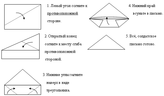 Конверт-треугольник – это обычно тетрадный лист бумаги, сначала загнутый справа налево, потом слева направо. Оставшаяся полоса бумаги (поскольку тетрадь не квадратной, а прямоугольной формы) вставлялась, как клапан, внутрь треугольника. Готовое к отправке письмо не заклеивалось — его всё равно должна была прочитать цензура. Почтовая марка была не нужна, адрес писался на наружной стороне листа.