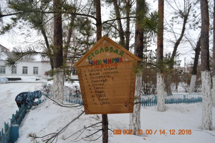 А для того, чтобы дети не забывали, чем можно кормить птиц, на одно из деревьев была повешена вывеска с меню «Столовой «Чик-чирик»», в котором перечислены доступные виды корма.