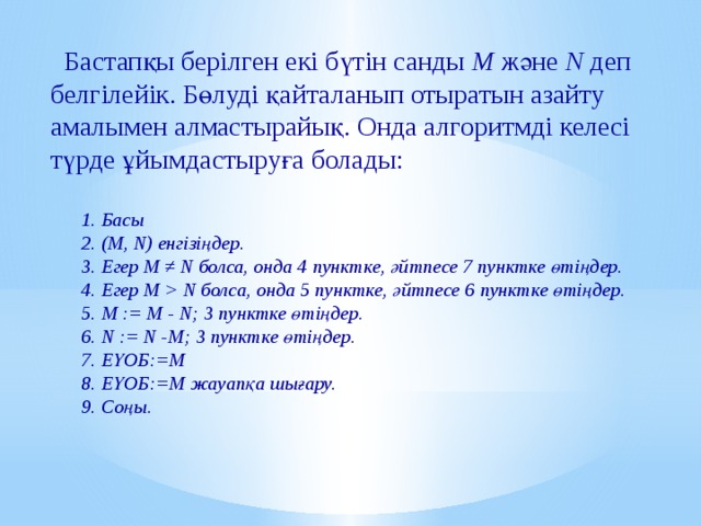 N болса, онда 5 пунктке, әйтпесе 6 пунктке өтіңдер. М := М - N; 3 пунктке өтіңдер. N := N -М; 3 пунктке өтіңдер. ЕҮОБ:=М ЕҮОБ:=М жауапқа шығару. Соңы. " width="640"