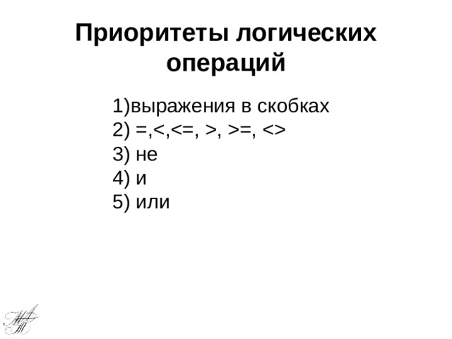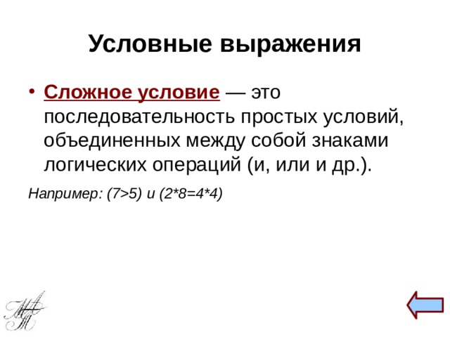 - Сложное условие — это последовательность простых условий, объединенных между собой знаками логических операций (и, или и др.).