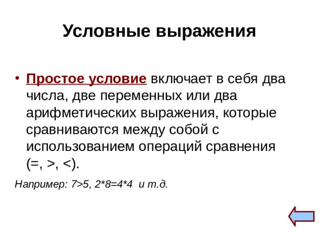 - Простое условие включает в себя два числа, две переменных или два арифметических выражения, которые сравниваются между собой с использованием операций сравнения (=, ,
