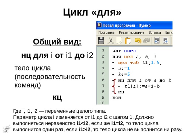Параметр цикла i изменяется от i1 до i2 с шагом 1. Должно выполняться неравенство i1 , если же i1=i2 , то тело цикла выполнится один раз, если i1i2 , то тело цикла не выполнится ни разу.
