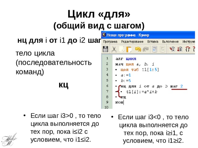 - Если шаг i30 , то тело цикла выполняется до тех пор, пока i ≤ i2 с условием, что i1 ≤ i2.