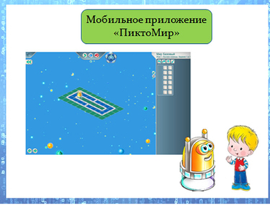 В мобильном приложении ПиктоМир главным персонажем является Робот-Вертун, который ремонтирует поля. Задание ребенок выполняет в форме игры, дискуссии, демонстрации, сотрудничества в малых группах и индивидуальной или парной работы. В процессе работы дети составляют из пиктограмм простейшие программы управления виртуальным роботом, движения которого изображаются на экране компьютера.