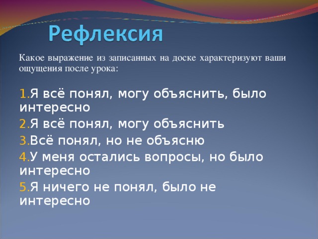Какое выражение из записанных на доске характеризуют ваши ощущения после урока: