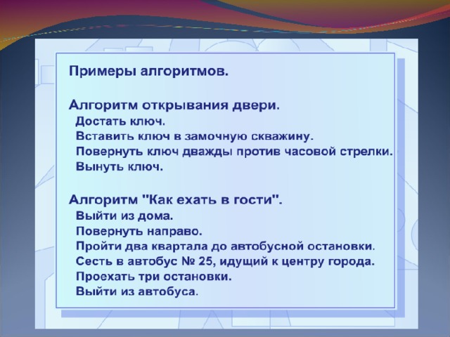 Алгоритм - это точное и понятное указание (инструкция) совершить последовательность действий, направленных на достижение указанной цели или на решение поставленной задачи