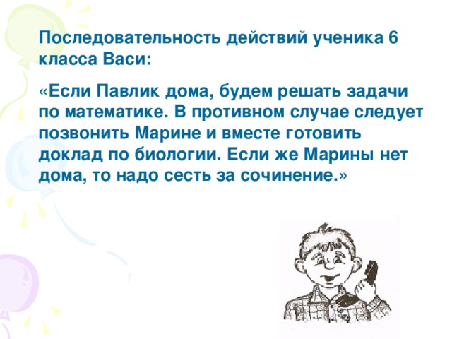 «Если Павлик дома, будем решать задачи по математике. В противном случае следует позвонить Марине и вместе готовить доклад по биологии. Если же Марины нет дома, то надо сесть за сочинение.»