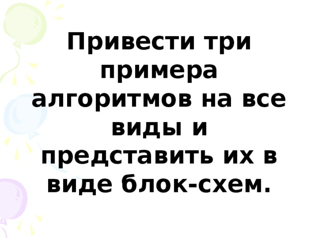 Привести три примера алгоритмов на все виды и представить их в виде блок-схем.