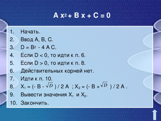 0, то идти к п. 8. Действительных корней нет. Идти к п. 10. X 1 = (- B - ) / 2 A ; X 2 = (- B + ) / 2 A . Вывести значения X 1 и X 2 . Закончить. " width="640"