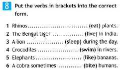 Основные понятия: названия стран и континентов, животных; тематическая лексика: carry, cobra, dangerous, deer, leopard, lion, rhino, tiger, use;