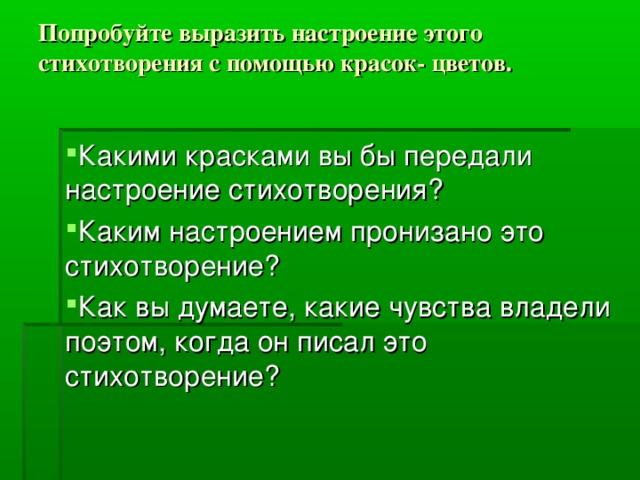 Попробуйте выразить настроение этого стихотворения с помощью красок- цветов.