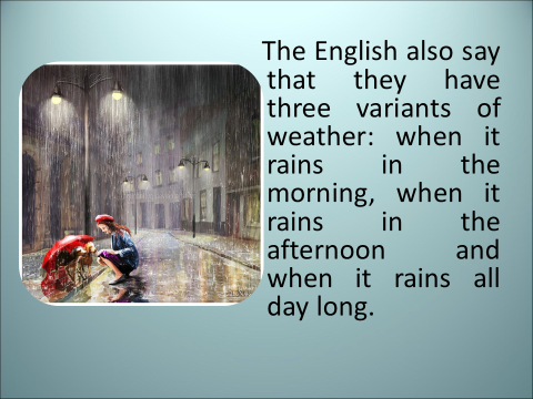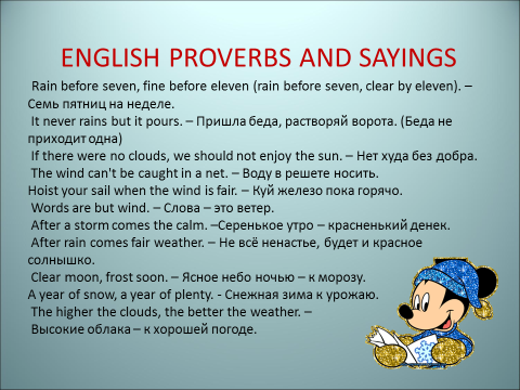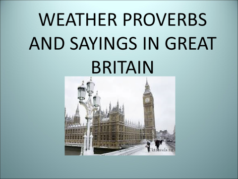Какие русские пословицы и приметы о погоде вы знаете? А знаете ли вы, что в английском языке тоже есть пословицы и приметы? (cлайд 4)