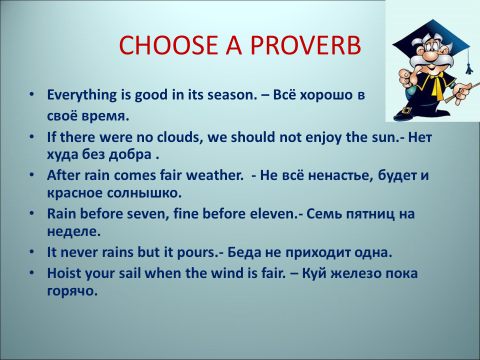 Читают пословицы и приметы и пытаются найти еще эквиваленты в русском языке. Записывают слова: to pour, to hoist, a sail, the calm.
