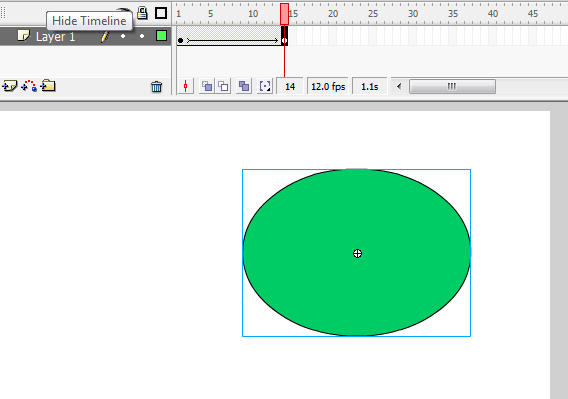 Щелкните правой кнопкой в ячейке первого кадра и в контекстном меню выберите команду «Создать двойное движение» (Create Motion Tween); при этом изображение шара будет автоматически преобразовано в графический символ (визуальным признаком преобразования служит появление точки привязки в центре шара и выделяющей синей рамки).