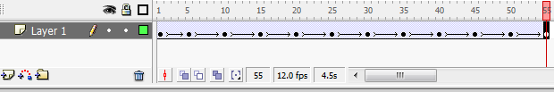 Щелкните правой кнопкой в ячейке кадра, который Вы хотите сделать последним в анимационной последовательности (например, 10-й), и в контекстном меню выберите команду «Вставить ключевой кадр» (Insert KeyFrame); в результате между первым и последним кадрами появится стрелка на сиреневом фоне.