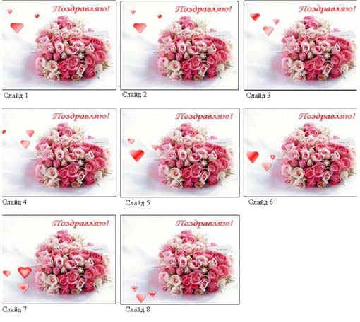 6. Внесите изменения на каждом слайде, измените форму, оттенок цвета заливки и положение каждого сердечка, так, чтобы сердечки, мерцая, последовательно опускались вниз.