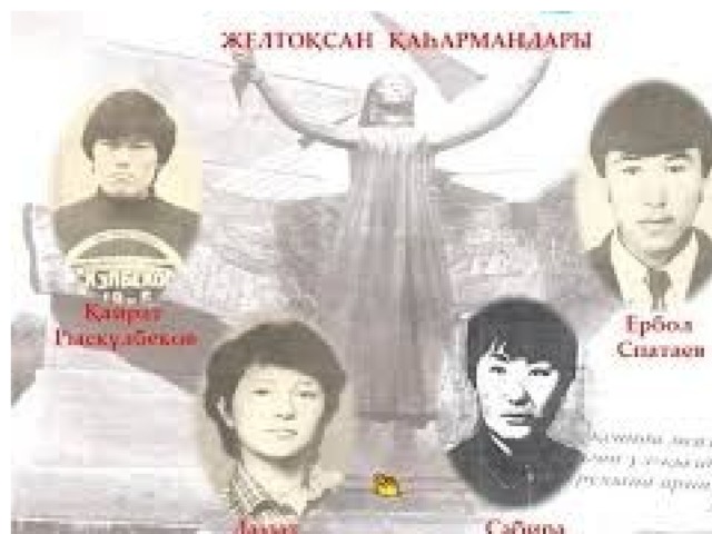 Елімізді? т?уелсіздік алу жолында?ы ата-бабаларымызды? ерлігін паш ету, о?ушылар?ажелто?сан ??рбандарымен, желто?сан о?и?асына ?атыс?ан а?а-апаларды? ерлігін ?лгі етіп к?рсету.