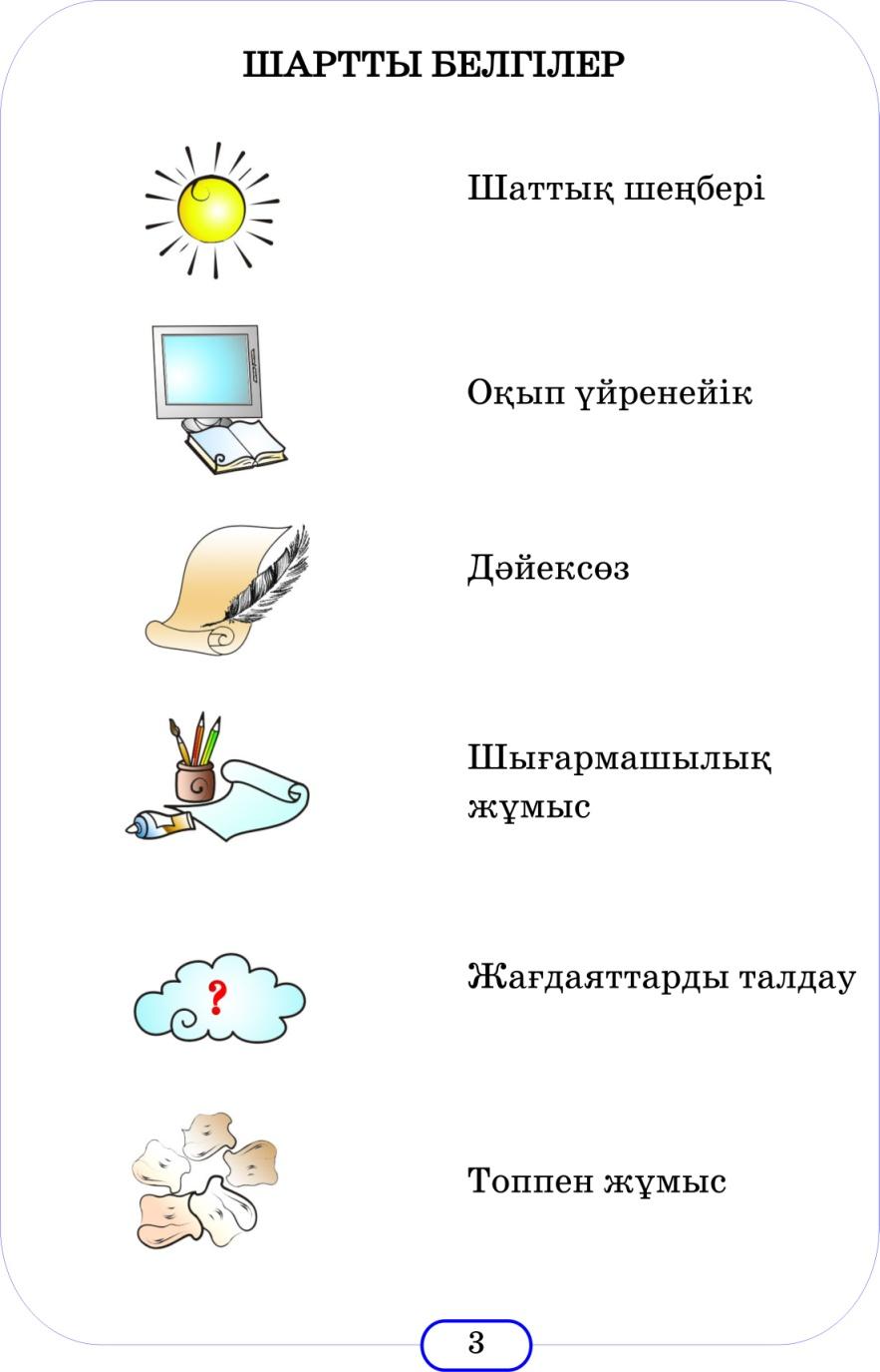 | Сабақ барысы: Ұйымдастыру кезеңi. Сабақтағы жағымды күйге келу. 5 Т ережесін еске түсіру (барлық ойымызды, сөзімізді, ісімізді осы ережеге бағындыру). Топқа бөлу: Оқушылар қоржыннан суреттерді таңдап алу арқылы төрт топқа бөлінеді. 1-топ: Қайырымдылық 2-топ: Жанашырлық 3-топ: Қамқорлық 4-топ: Жауапкершілік. Тыныштық сәті: Орманға ойша серуен Мұғалім: Арқаңызды тік ұстап отырыңыз. Көзіңізді жұмып, терең тыныс алыңыз. Әрбір тыныс алған сайын неғұрлым көбірек босаңсып, сабырлы болуға тырысыңыз. Қазір біз орманға серуенге шығамыз. Өзіңіздің сынып есігіне қарай беттеп, есікті ашқаныңызды, дәлізбен өтіп, далаға шыққаныңызды елестетіңіз. Таза ауаны терең жұтып, шашыңызды желбіреткен желдің лебін және бетіңізді сәл-пәл қыздырған күн сәулесін сезініңіз. Орманға қарай жүре бастаңыз. Келе жатқанда абай болыңыз, жәндіктерді басып кетпеңіз. Айналаңызға зейін салыңыз. Табиғаттың әсемдігі мен балғындығын сезініңіз. Жап жасыл шөптер, жайқалған гүлдер, сылдырлап аққан бұлақ, әнші құстар... Сіз табиғат аясында өзіңізді бақытты әрі қауіпсіз сезінесіз. Терең тыныс алыңыз және қоршаған айналаның жым- жырт тыныштығына көңіл бөліңіз. (Осы жерде мұғалім 1-2 минут үзіліс жасауына болады). Бізге қалайша жеңіл әрі тыныш және өзімізді бақытты сезіну қандай ғажап. Іштей айтыңыз «Мен бақыттымы», «мен баққытты баламын», «мен бақыттымын». Осы жым- жырттық, тыныштық, қанағат сезімін өзіңізде сақтаңыз. Көзіңізді ашып, күлімсіреңіз!