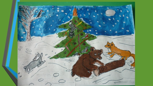 Жители лесного царства: медведь Миша, заяц Яшка, белка Карина, лиса Алиса, снегирь Сева, дятел Тёма решили устроить на лесной поляне праздничный концерт . В центре поляны стояла красавица-ёлка. Друзья решили украсить её своими игрушками-зимними запасами. Заяц принёс свою сочную морковку , белочка орехи и бусы из ярких ягод рябины . Красногрудые снегири уселись на веточки ели. Они и без игрушек стали украшением ёлки. Медведь Миша принёс большое бревно для гостей. Забарабанил зимнюю трель пёстрый дятел. Он сообщил всем лесным жителям о начале праздника.
