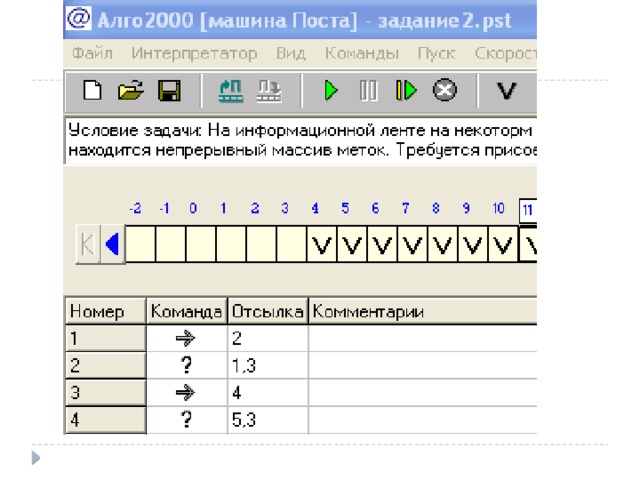 - Задача: Написать для машины Поста программу вычитания двух чисел, разделенных одной пустой клеткой. Уменьшаемое меньше вычитаемого. Начальное положение каретки над левой меткой вычитаемого.